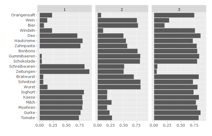 Cluster 2 (53,5% der Warenkörbe) hat eine geringe Wahrscheinlichkeit für Gemüse und Milchprodukte, aber eine hohe Wahrscheinlichkeit für Fleisch und Alkohol.