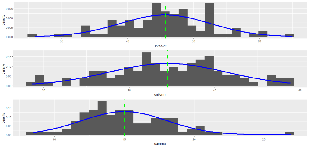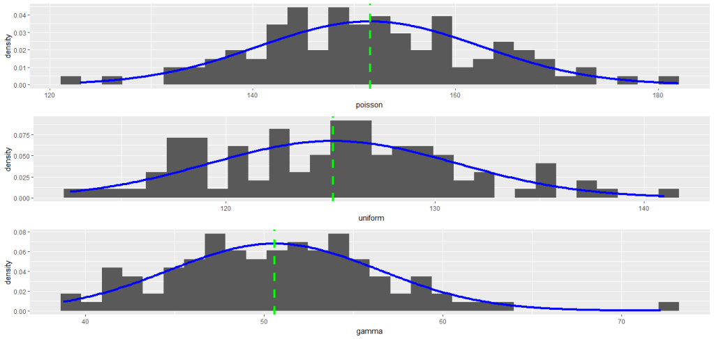 Mit zunehmender Anzahl an Beobachtungen n fangen die Summenwerte an, approximativ einer Normalverteilung zu folgen und eine symmetrische Form anzunehmen (siehe grün eingezeichneter Mittelwert). Das gilt sowohl für Beobachtungen aus einer schiefen Verteilung (Gamma Verteilung, dritte Zeile in den Abbildungen), also auch die Summe von diskreten Zufallsvariablen (jeweils erste Zeile aus der Poisson-Verteilung).
